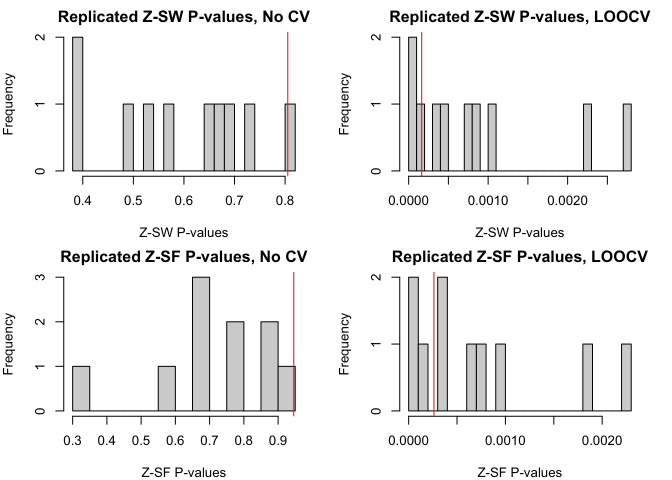 hist(sf.kidney.cv,main="Replicated Z-SF P-values, LOOCV",breaks=20,