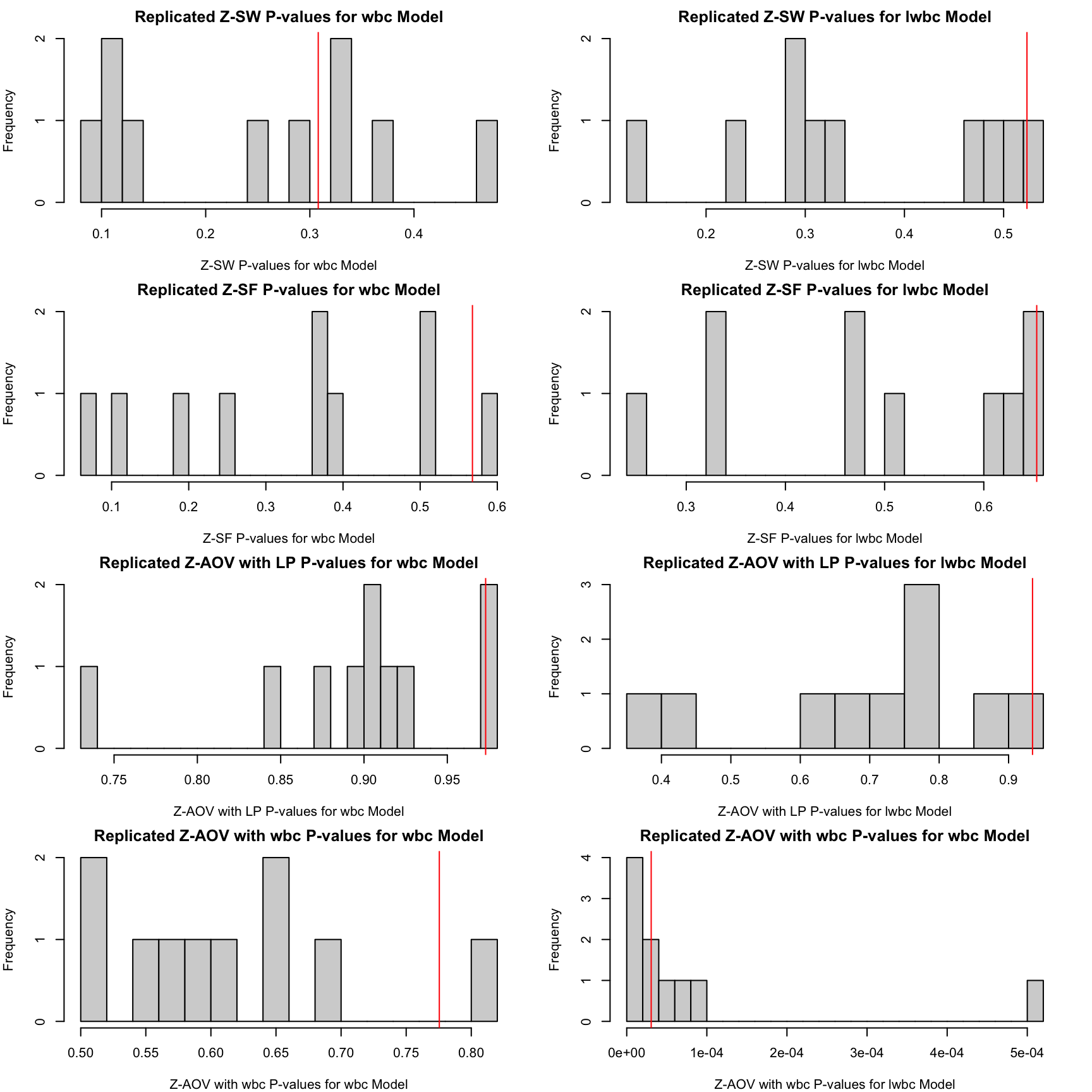 The histograms of 1000 replicated Z-residual test p-values for the wbc and lwbc models. The red vertical lines in these histograms show the upper bound summaries of these replicated p-values, p_{min}. These histograms show that the Z-SW, Z-SF, and Z-AOV with LP tests for both models give a large proportion of p-values greater than 0.05, and the large p-values result in large p_{min} values. In contrast, the replicated Z-AOV with log(wbc) p-values for the lwbc model are almost all smaller than 0.001. The consistently small Z-AOV with log(wbc) p-values further confirm that the log transformation of wbc is inappropriate for modelling the survival time.