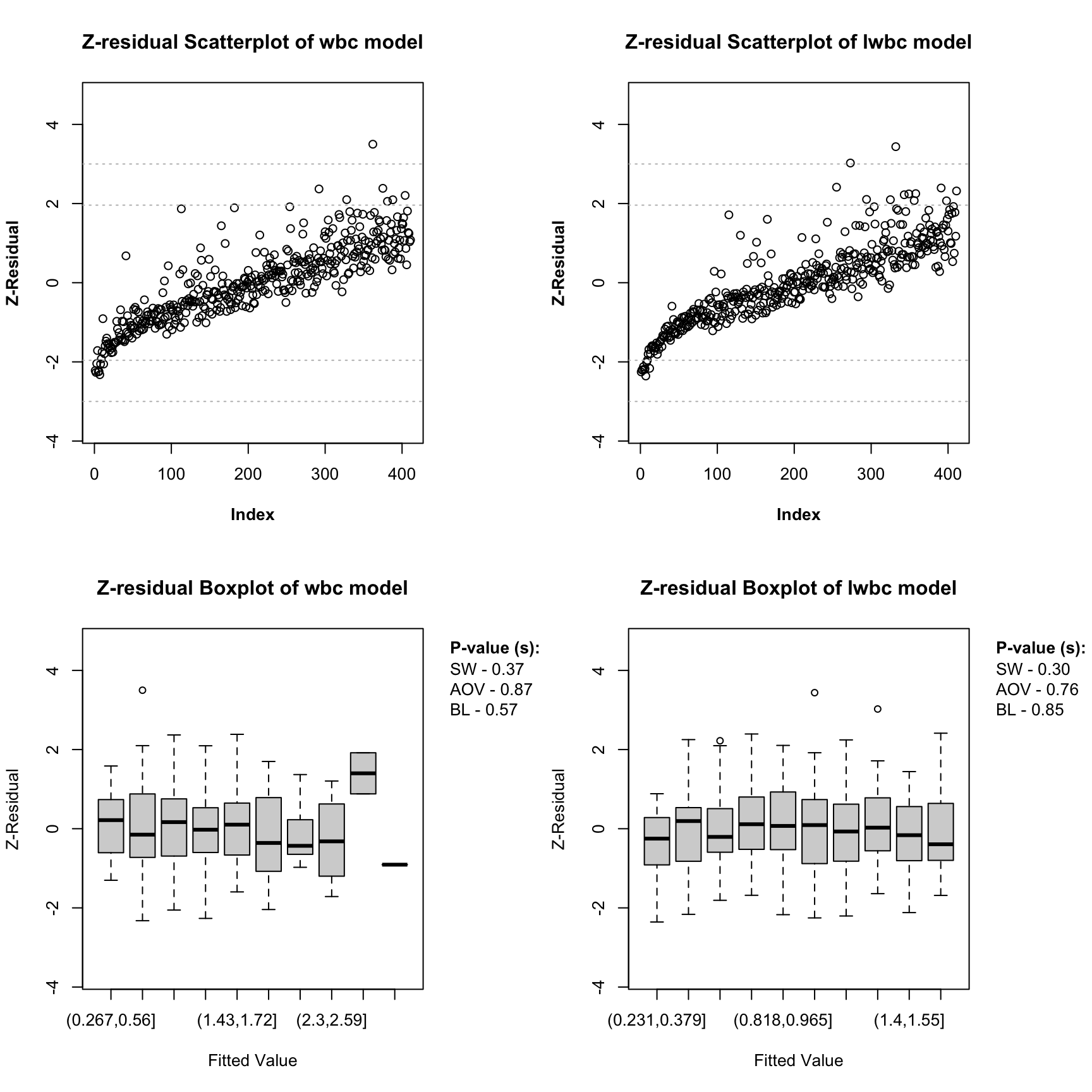 The scatterplots of Z-residuals against the linear predictor don’t exhibit visible trends; their LOWESS lines are very close to the horizontal line at 0; the boxplots of Z-residuals grouped by cutting linear predictors into equal-spaced intervals appear to have equal means and variance across groups. The Z-AOV and Z-BL for linear predictors tests also gives large p-values for the wbc and lwbc models, where Z-AOV and Z-BL are the methods of applying ANOVA and Bartlett to test the equality of the means and variances of Z-residuals against the groups formed with the linear predictor.
