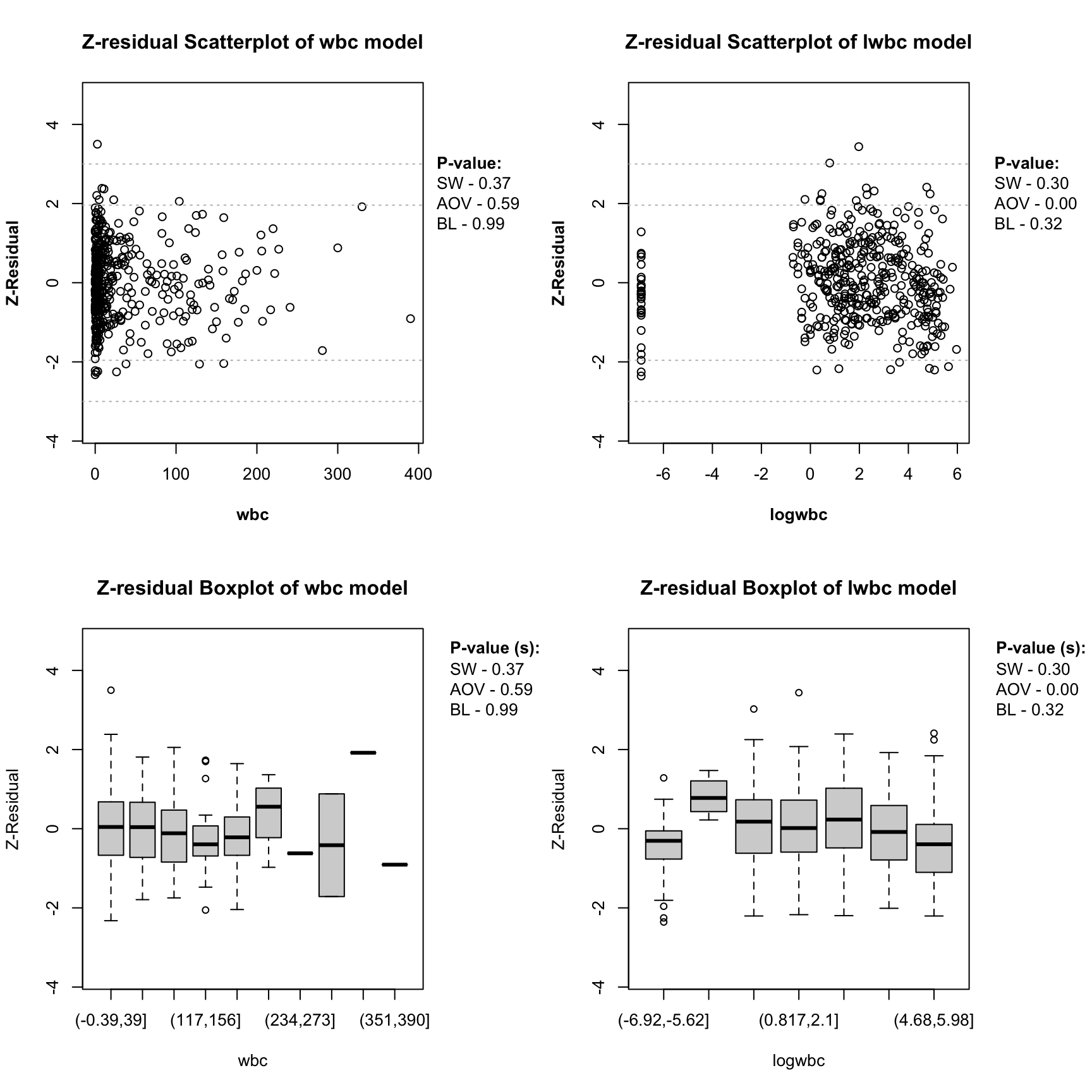 The above diagnostics results reveal no serious misspecification in these two models. However, the inspection of the Z-residuals against the covariate wbc/log(wbc) reveals that the functional form of the lwbc model is likely misspecified. The scatterplots and comparative boxplots of the Z-residuals against wbc/log(wbc) are shown below. The LOWESS curve of the wbc model appears to align well with the horizontal line at 0 and the grouped Z-residuals of the wbc model appear to have equal means and variances across groups. However, the diagnosis results for the lwbc model are very different. It appears that there is a non-linear trend in the LOWESS curve of the lwbc model and the grouped Z-residuals appear to have different means across groups. The Z-AOV and Z-BL for covariate wbc and log(wbc) also gives p-values for the wbc and lwbc models as shown in the boxplots. The very small p-value of the Z-AOV for covariate log(wbc) test for the lwbc models strongly suggests that the log transformation of wbc is likely inappropriate for modelling the survival time.