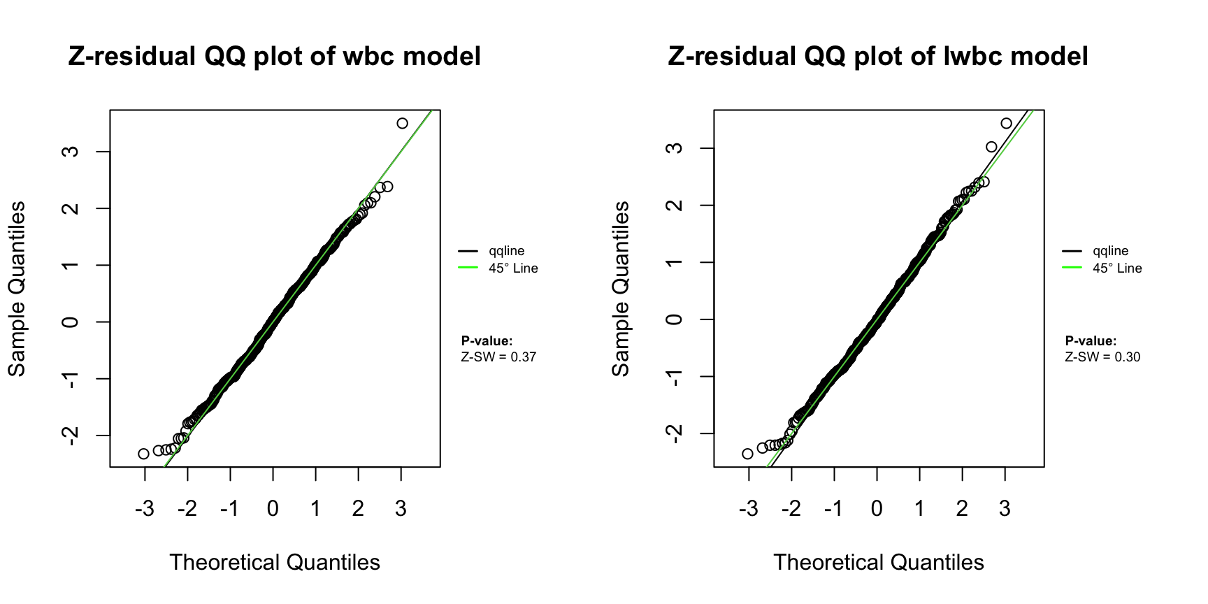 A QQ plot based on Z-residuals can be used to graphically assess the model’s overall GOF, and Shapiro-Wilk (SW) or Shapiro-Francia (SF) normality tests applied to Z-residuals can be used to numerically test the overall GOF of the model. We can see that the QQ plots of Z-residuals of these two models align well with the 45 ^\circ diagonal line. The Z-SW tests also give large p-values for two models, where Z-SW is the test method that the normality of Z-residuals is tested with the SW test.