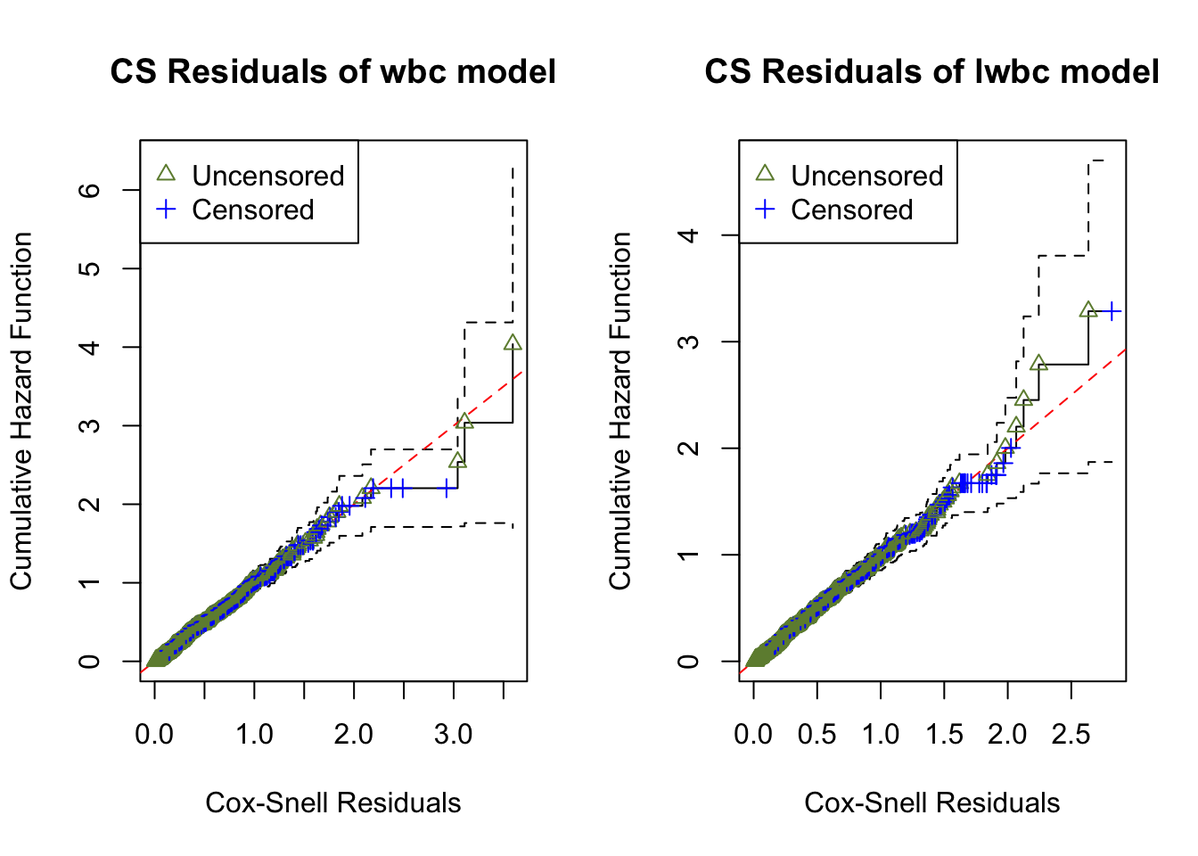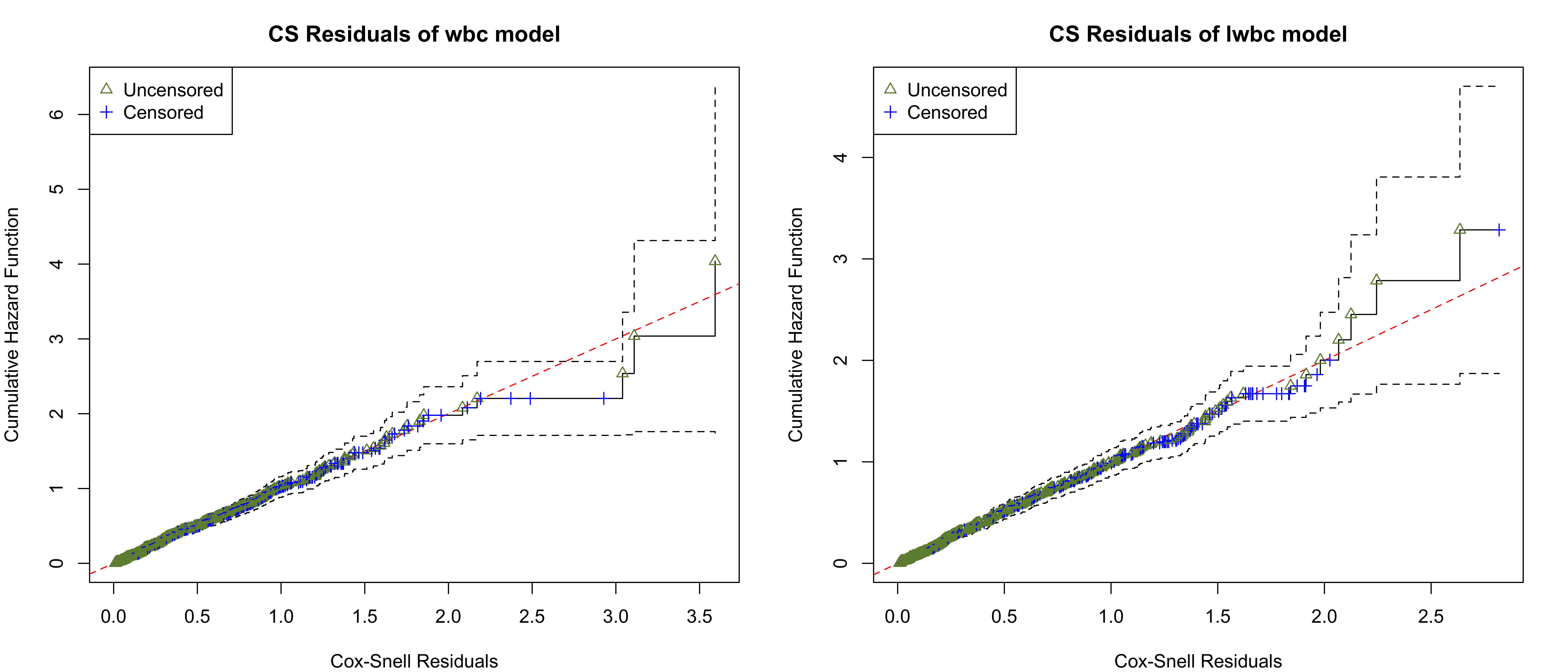 The overall GOF tests and graphical checking with Cox-Snell residuals show that both the wbc and lwbc models provide adequate fits to the dataset. The estimated CHFs of the CS residuals of both of the wbc and lwbc models align closely along the 45^{\circ} diagonal line.
