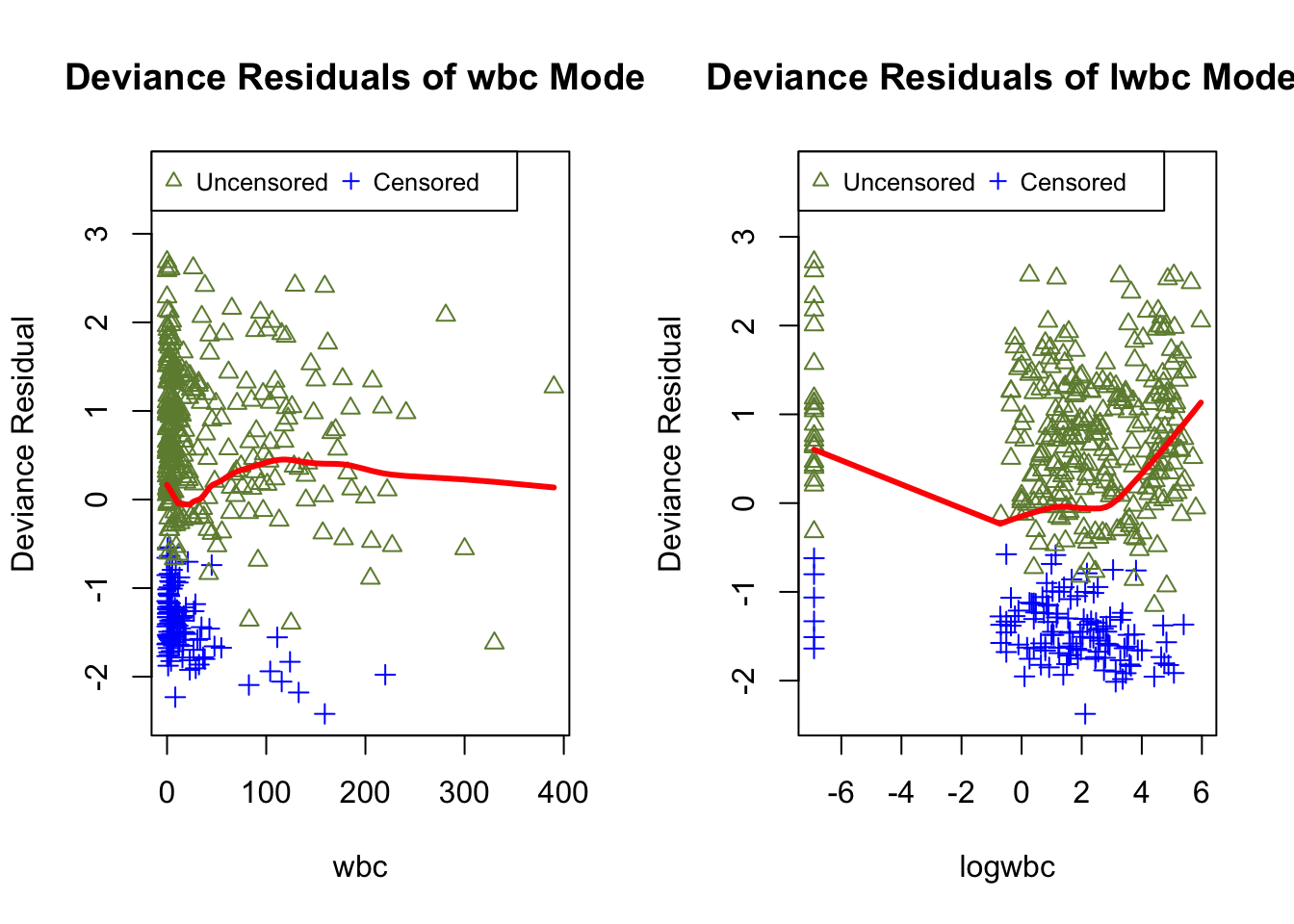 The deviance residuals are more symmetrically distributed than martingale residuals and they are mostly within the interval (-3, 3). In both models, the scatterplots of deviance residuals exhibit strikingly non-horizontal trends in their LOWESS curves.
